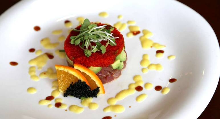 Spicy tuna avocado topped with assorted fish. Financial District Boston Hotels.
